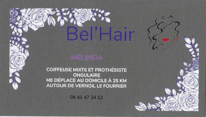 Je m'appelle Mélinda Couillebault, je suis diplômée depuis 22 ans en Coiffure et j'ai réalisé une formation en Prothésie Ongulaire reconnue par l'état avec la validation par une Certification. A cela, j'ai décidé de créer mon auto entreprise "Bel'Hair" en vous proposant des prestations de services en Coiffure mixte et Prothésiste Ongulaire à votre domicile sur Vernoil le Fourrier et ses alentours "autour de 25 km".