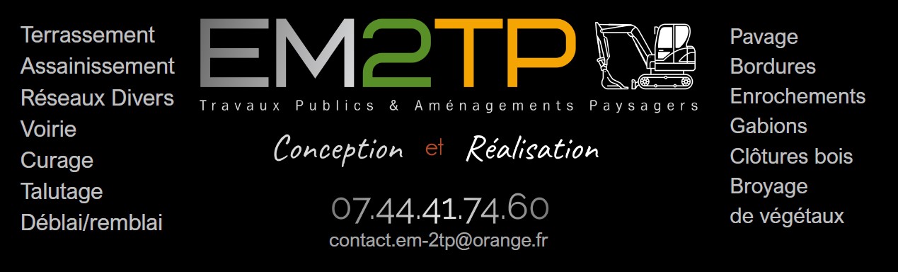 EM2TP est une entreprise de Travaux Publics et d'Aménagements Paysagers dans le secteur Nord Est Anjou. Créée en 2025, elle est le résultat de nombreuses années d'activités dans ce domaine.