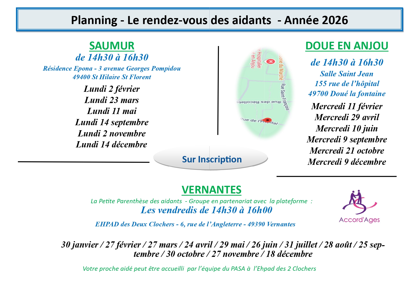 Vous trouverez ci-dessous les dates des rendez-vous des aidants, à l'EHPAD des deux clochers à Vernantes