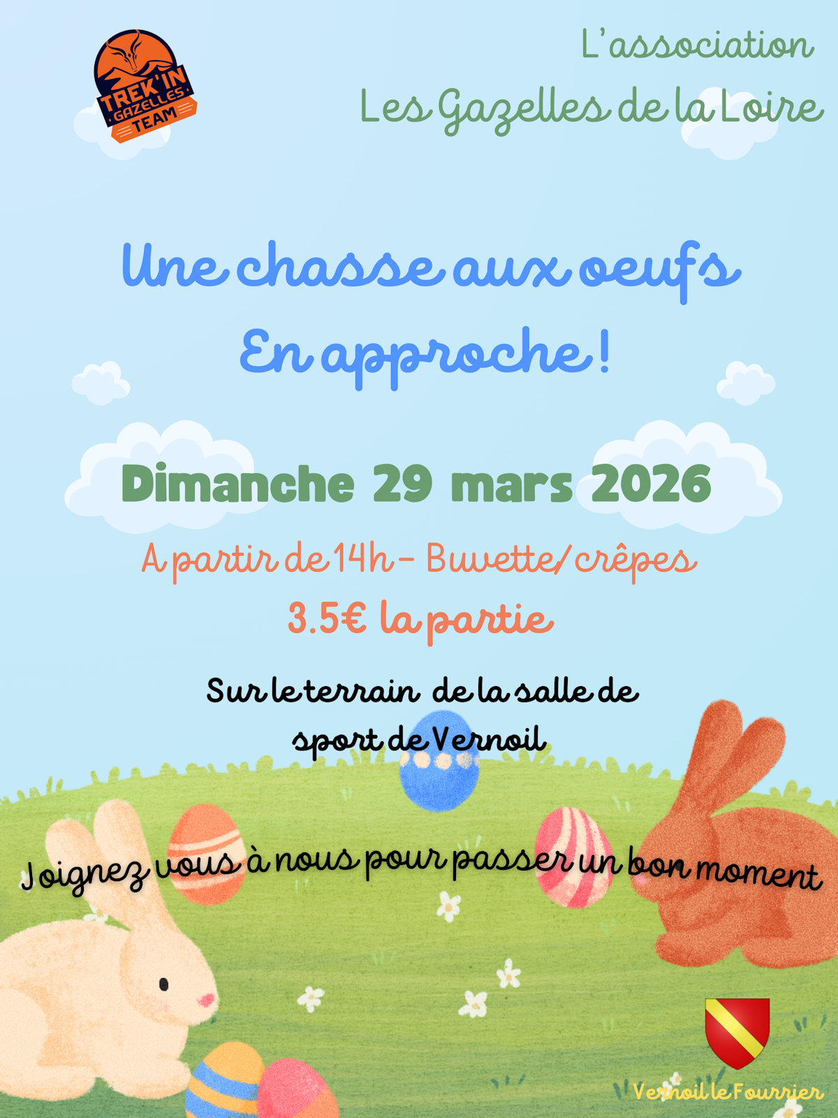Chasse aux œufs de Pâques le dimanche 29 MARS 2026. Les écoles de Vernoil et Vernantes ont eu, ou vont avoir des bulletins d'inscription. Mais tous les enfants des alentours sont invités à participer !