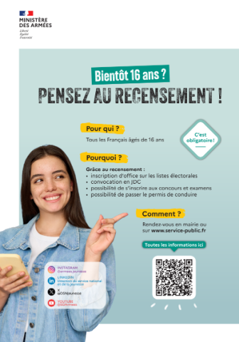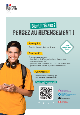 Tous les jeunes, de nationalité française, garçons et filles, doivent se faire recenser à la mairie de leur domicile. Cette obligation légale est à effectuer dans les 3 mois qui suivent leur 16ième anniversaire.
